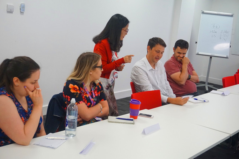 在初步理解汉字和拼音之间的关系后,卡迪夫大学的老师们跟着杨教授学拼音。杨教授根据在场老师们英文名字的特点,为他们选取了优雅动听的中文名字,并标注拼音,老师们非常开心地跟着杨教授拼读自己的中文名字。