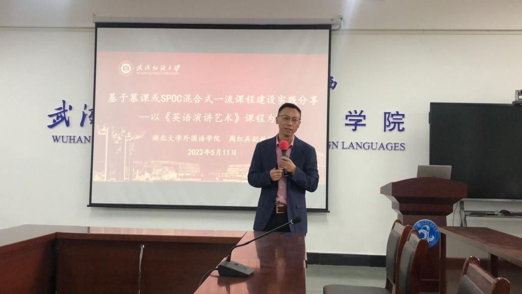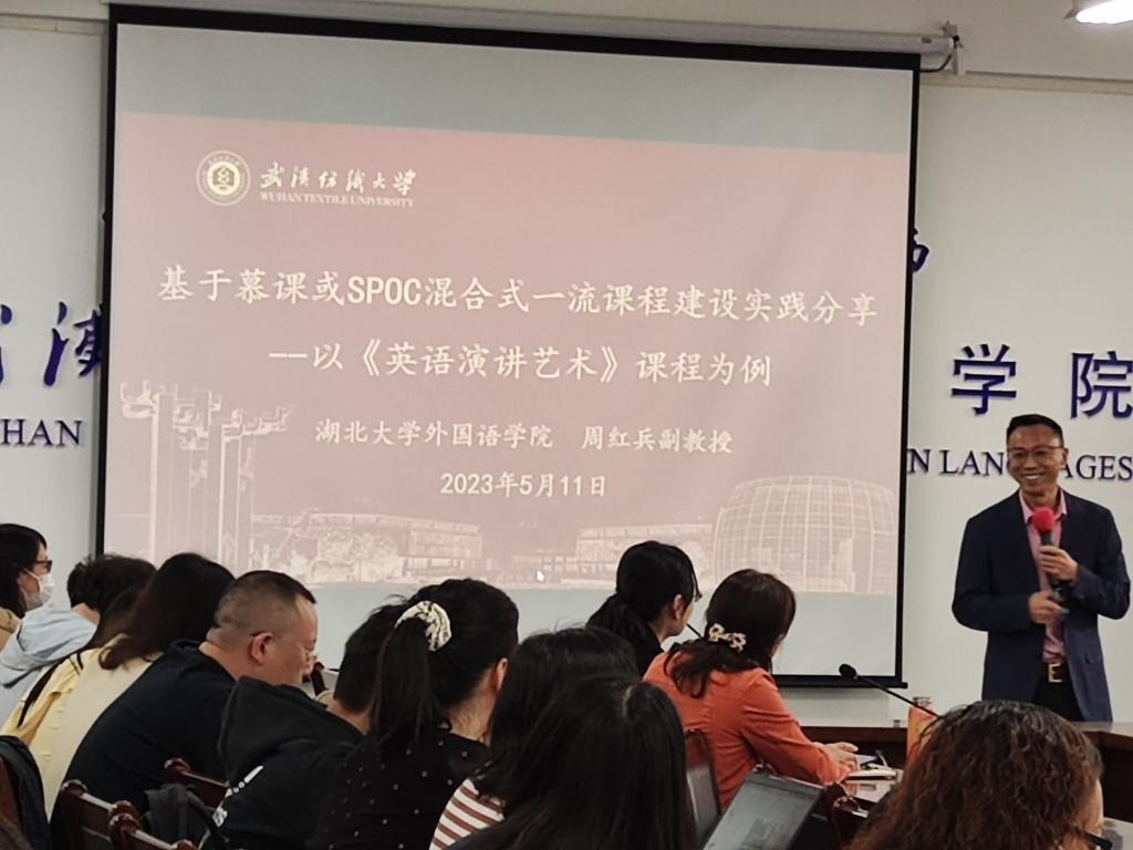 5月11日下午,在学院301会议室,来自湖北大学williamhill官网的周红兵教授为全院教师做了一场精彩的讲座,题目为:混合式课程设计的路径与教学创新手段提升的方法,讲座由副院长刘方荣主持。周教授是教育部本科线上一流课程及混合式一流课程评审专家,湖北省演讲协会英语演讲专业委员会主任委员,此次是受学院领导的邀请来作经验分享和课程申报指导,旨在提升学院的一流课程申报质量。
