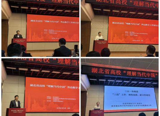 为全面贯彻落实党的二十大精神,深入学习习近平总书记在中央政治局第五次集体学习时重要讲话精神,贯彻《高等学校课程思政建设指导纲要》相关要求,推进《习近平谈治国理政》多语种版本进高校进教材进课堂(“三进”)工作,10月16日,由湖北省教育厅指导、教育部高等学校外国语言文学类专业教学指导委员会、华中师范大学外国语主办、外语教学与研究出版社协办的湖北省高校“理解当代中国”外语教学工作研讨会在华中师范大学召开。williamhill官网williamhill官网院长谭燕保教授应邀作主旨发言,分享了本校《理解当代中国阅读与写作》课程建设的思考、路径、实践、初步成果以及近远期建设目标。
