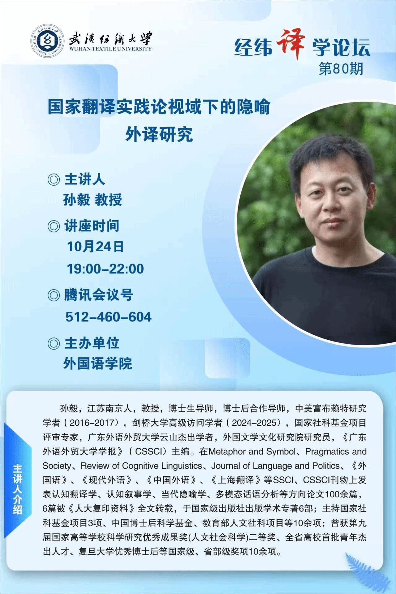 10月24日,广东外语外贸大学孙毅教授受邀做客williamhill官网第八十期经纬译学论坛,带来线上学术讲座,williamhill官网教师和22级、23级及24级MTI学生参加聆听了讲座内容。讲座由副院长刘方荣主持。