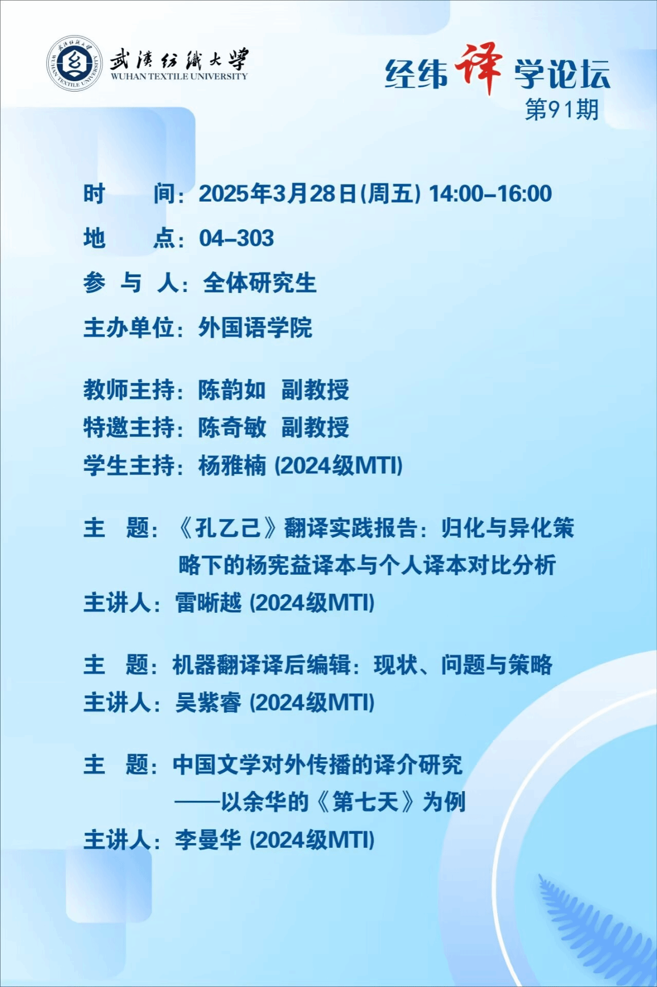 3月28日,williamhill官网在崇文楼303教室成功举办了第九十一期“经纬译学”研究生论坛。本次论坛由陈韵如副教授和陈奇敏副教授担任教师主持,24级MTI杨雅楠同学担任学生主持。论坛邀请了三位主讲人,分别是24级MTI的雷晰越、吴紫睿、李曼华三位同学。24级全体研究生参与了此次论坛活动。