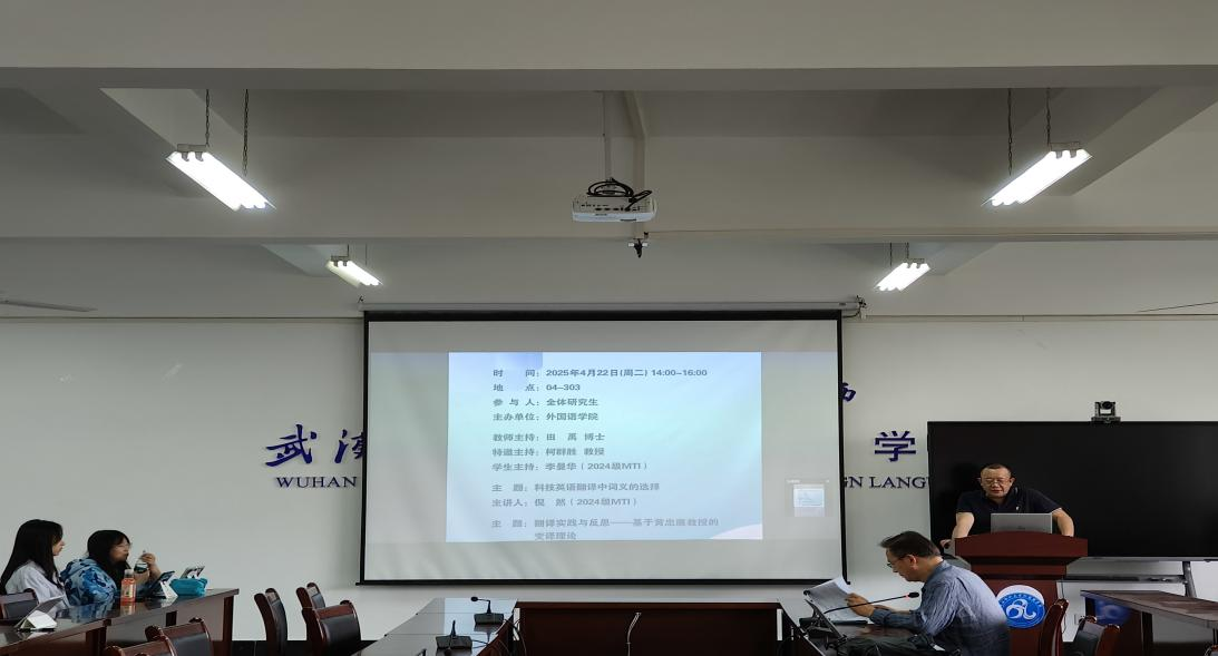 4月22日,williamhill官网在崇文楼303教室举办了第九十三期“经纬译学”研究生论坛。柯群胜教授和田禹博士分别作为特邀点评嘉宾和教师主持,24级MTI研究生李曼华担任学生主持。倪然、黄赢纪、吴传琦三位24级MTI研究生在论坛上进行了分享。
