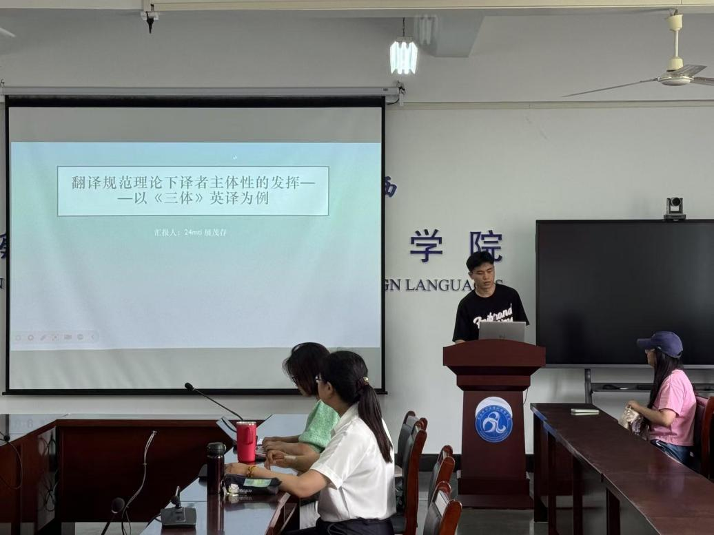 第一位汇报人展茂存的主题为翻译规范理论下译者主体性的发挥——以《三体》英译为例,展茂存的汇报分为五个部分,层层递进,条理清晰,他的分享首先从翻译规范理论开始,指出翻译规范可以分为三个层次, 即初始规范、预备规范和操作规范,让同学们对于翻译规范理论有更大了解,然后结合具体翻译中的译注,指出了刘宇昆英译《三体》的过程中的创新之处,在此过程中,同学们充分理解中国文学作品的海外译介的方法。
