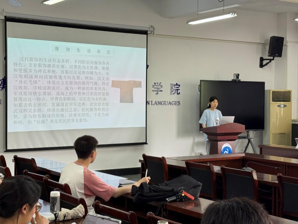 第二位汇报人梁琳同学以汉代服饰文化英译策略探析为主题,指出了服饰审美文化生态,以及服饰生活形态。梁琳同学首先进行服饰审美文化生态介绍,而后对审美观念差异进行了简要介绍,然后阐述了服饰文化负载词英译过程中的方法,表明服饰文化负载词翻译时的策略。