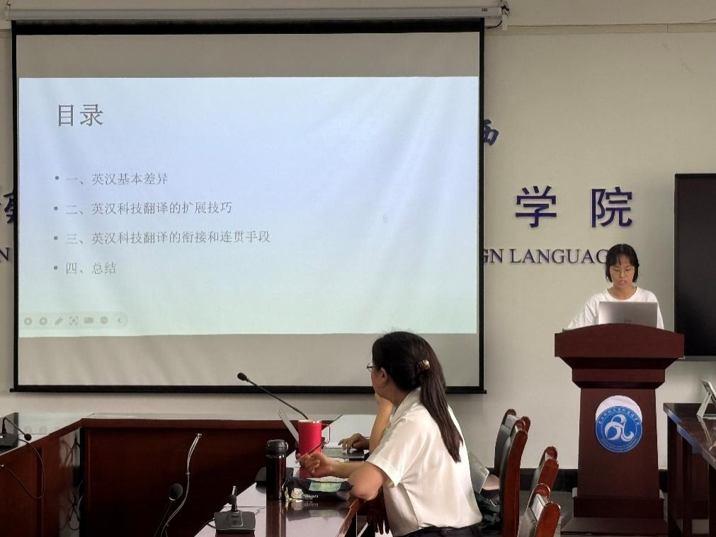 第三位汇报人钱灿同学的主题是扩展技巧在英汉科技翻译中的应用。钱灿同学结合众多实例,讲述了科技翻译中扩展的重要性,指出英汉语言的基本差异。同时也介绍了英汉科技翻译的扩展技巧,即分列式扩展,词义显化式扩展,回述式扩展和修辞式扩展。最后总结汉语总体上具有连续性强、界限性弱、界限标记使用少的特点,而英语则具有断续性强、界限性强、界限标记使用多的特点。通过扩展技巧补充逻辑、显化意义、调整结构,让译文既准确又自然。