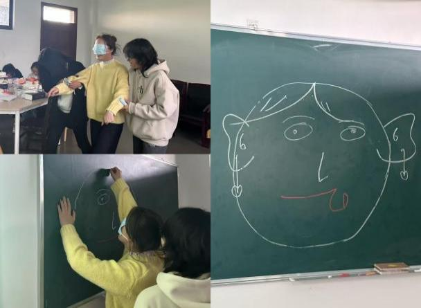 “盲眼画五官”将活动推向了高潮。队员们需蒙上眼睛,原地转5圈后,在其他组员的言语指挥下走向黑板完成画作。现场指令声、欢笑声此起彼伏,有的画作“五官错位”,令人捧腹。这个游戏极大地考验了团队的信任度与协作能力,让大家在欢乐中体会到有效沟通与相互支持的重要性。