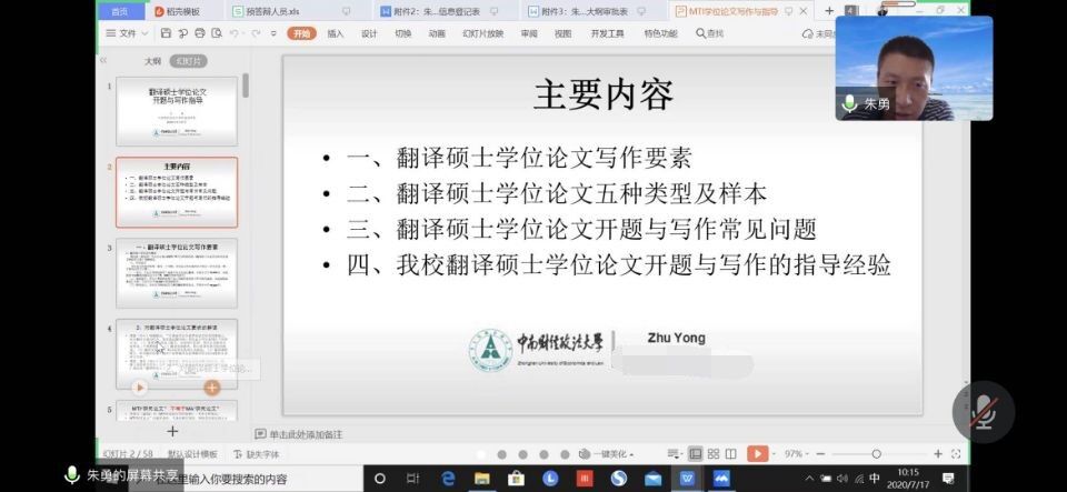 为推进williamhill官网MTI人才培养工作,提高硕士生导师翻译硕士学位论文的指导水平,7月17日上午,学院邀请中南财经政法大学williamhill官网MTI中心主任朱勇副教授莅临云端,就翻译硕士学位论文的各方面相关工作展开培训与释疑,谭燕保院长、MTI教育中心全体硕士生导师和部分任课教师在云端参会。会议由柯群胜副院长主持。