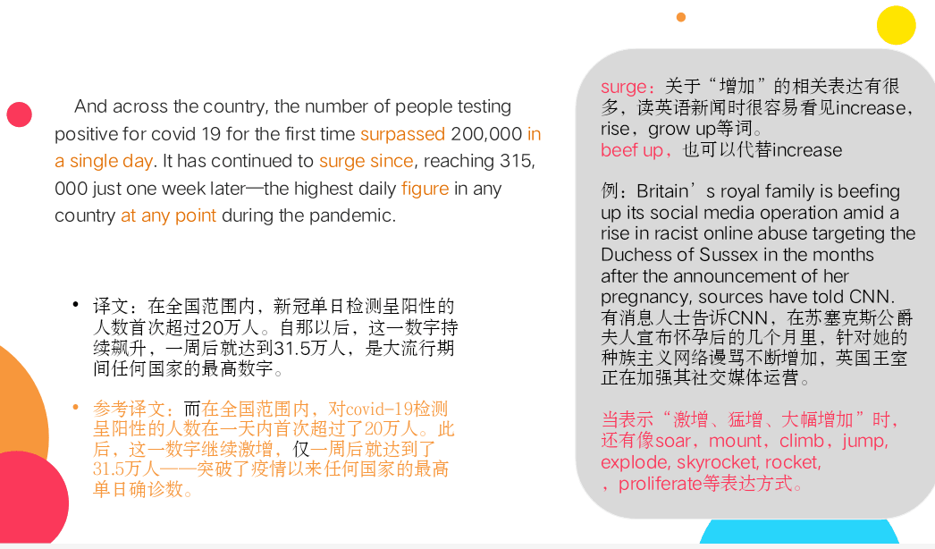 肖甜同学以“经济学人外刊精读分享”为主题,分析了India’s covid catastrophe的前三段。首先梳理整篇文章的大概内容,然后具体讲解了一些词的用法,总结了关于“增加”的一系列表达以及一些固定表达。如mark的熟词僻义,可以表示庆祝,纪念〔重要事件〕。关于“增加”的相关表达也有很多,除了本文中的surge,英语新闻中也经常出现increase,rise,grow up、beef up等词。当表示“激增、猛增、大幅增加”时,则可以用soar,mount,climb,jump, explode, skyrocket, rocket,proliferate等表达方式。还有double mutant(双突变体)和COVAX(新冠肺炎疫苗实施计划)。而且介绍了文中涉及的文化背景知识-印度大壶节(Kumbh Mela)。