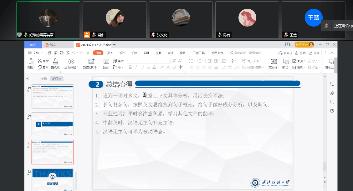纪维同学以“2021政府工作报告翻译心得”为主题进行了分享,整理了政府工作报告中的翻译难点和解决办法。例如,遇到一词对多义时,要根据上下文具体分析,灵活变换译法;长句和复杂句药按照英文思维找句子框架,给句子做好成分分析和断句;平时多注意积累专业性词汇,多学习其他文件的翻译;在进行中译英时,汉语无主句需要补充主语或译为被动语态等。