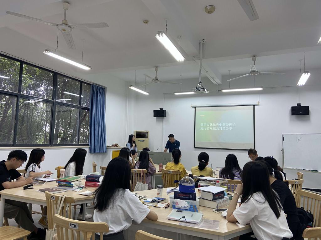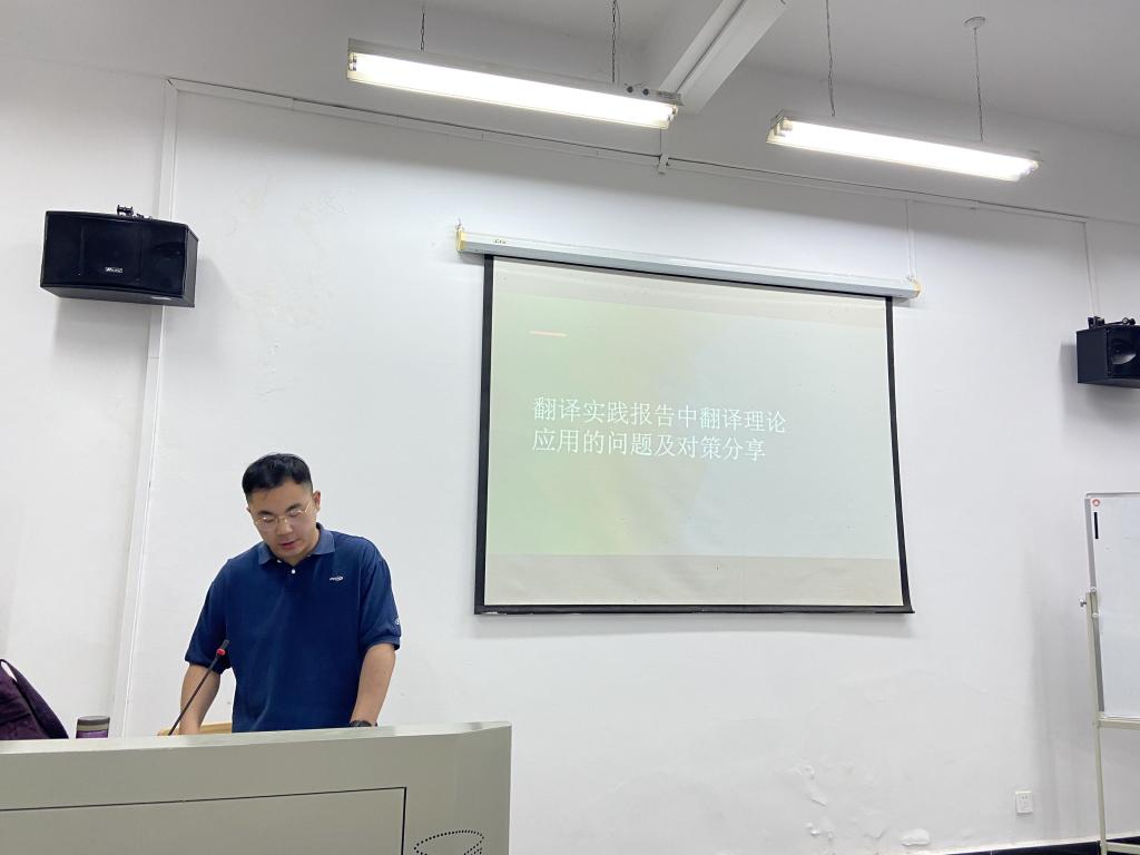 首先,程耕同学以“翻译实践报告中翻译理论的应用问题及对策分享”为主题,阐述了“要避免理论和实践‘两张皮’”等重要问题,并建议同学们依照文本选理论,通过综合选题来源、文本难度、背景知识收集、理论和实践相结合等多方面信息,选择最合适的理论,牢记“案例分析是主体”。其次,程耕同学以自己毕业论文中的具体语句为例,通过实例向同学们展示应如何结合理论与实践,避免“虎头蛇尾”,并就翻译文本的选择提出了切实建议。
