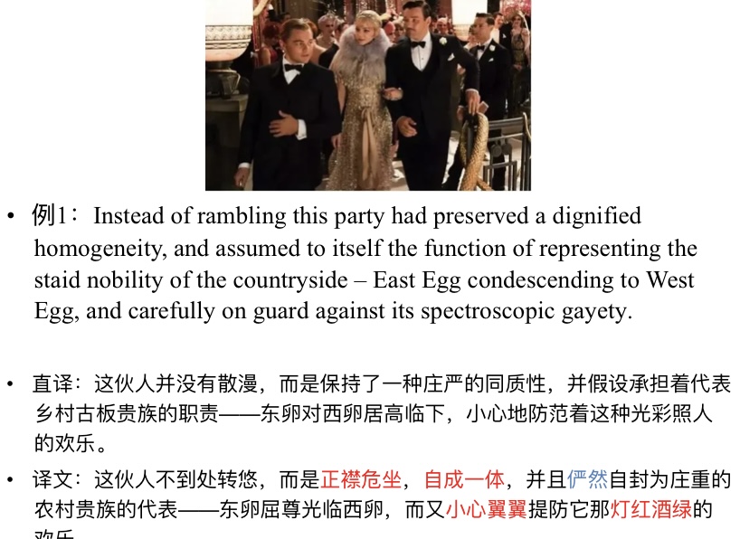 郑震同学主讲的题目是“《了不起的盖茨比》之巫氏译本分析—以生态翻译学为视角”,他的内容分为了四个部分。第一部分,使用了大量电影图片来介绍了本次的翻译主题“了不起的盖茨比”,并对电影故事内容进行了简单描述。第二部分,介绍了作品的译者--翻译家巫宁坤,以及对生态翻译学展开了详细讲解,其中涉及到翻译过程,翻译原则,翻译方法和翻译评判标准。第三部分,从多个维度对巫氏译本进行了分析,并提出了译本的少量瑕疵。最后,郑震同学进行了总结和反思,鼓励我们学习巫氏译本的精湛技巧和翻译风格。两位同学发言完毕后,同学们提出了自己的想法和见解,并得到了一一解答。随后,华敏老师对两位同学的分享进行了点评,她认为左灿同学准备充分,融入了自己的观点和思考,同时针对“正式性用词”提出了疑问还提出了“不同翻译应采取不同翻译理论”。对于郑震同学,华敏老师肯定了他本次的学术精神,认为生态翻译学是个很好的翻译视角,并从各个维度提出了自己的看法,还鼓励我们积极思考在翻译过程中哪些翻译理论适用于指导实践。随后,罗院长肯定了二位的悉心准备,认为左灿同学善于思考,但文中部分用词值得深推。认为郑震同学从多方面阐释生态学翻译可谓见解独特,后期应深入研究。最后,姚范美教授对二位同学进行了点评,她认为左灿同学认真细心,准备充分,郑震同学将理论和实际联系起来,值得我们学习。