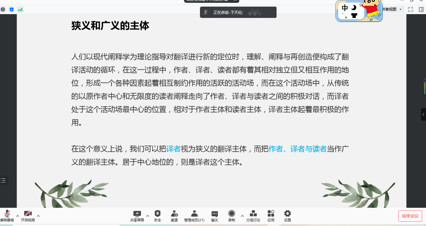 2022年1月19日晚,williamhill官网williamhill官网在线上成功举办第三十五期“经纬译学”研究生论坛。本次论坛由罗绮伦副院长主持,21级研究生涂晶晶和于天伦主讲,副院长柯群胜教授、刘方荣副教授和全体翻译硕士研究生参加了此次论坛。
