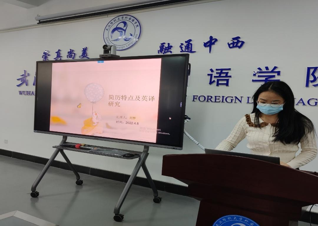 然后刘珊老师进行了点评,她认为学生要平衡好研究和翻译实践的关系,并将翻译实践作为MTI学生的主要任务。她建议郭文龙同学可以去查找电影名称的术语库,发现并总结规律,再适当阅读电影方面的论文。刘珊老师认为这其实就是一个实践-研究-找差异的过程。同时刘珊老师回答了同学们的困惑,郭文龙电影命名分类“物”、“主题”其实是存在交叉的,这种分类方法值得商榷。刘珊老师建议郭文龙同学可以将重心放在“中国电影的英译及其传播”上,并学会运用实例来支撑理论。针对刘梦同学的报告,刘珊老师建议同学们以后用英语进行分享。然后指出刘梦同学关于简历的介绍不太严谨,容易产生误导性。她提出归纳总结都是建立在可比语料的大量阅读上。刘珊老师也认为“性别”在简历上也是可以省去的一点,避免产生误会和纷争。最后刘珊老师分享了一份文档供同学们学习,并要求我们注意简历格式和用词的特点以及规律。