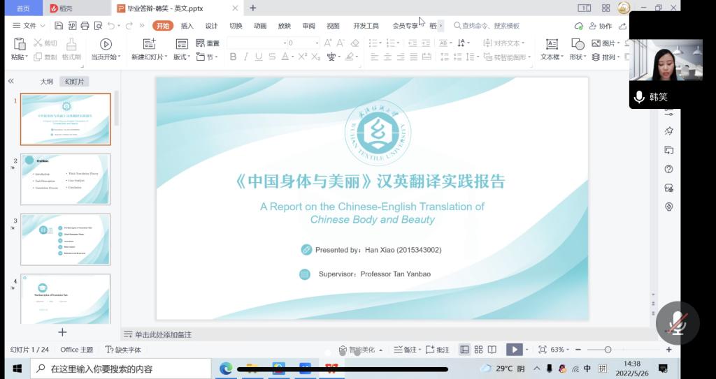 参加答辩的学生报告论文的主要内容,时间为5分钟,在答辩过程中,研究生以图文并茂的形式,结合PPT阐述自己论文的选题目的、理论框架、翻译项目的准备、翻译难点实例分析及反思。随后,答辩委员会成员分别对答辩学生提问,指出论文中存在的问题并给出建议,时长为15分钟。湖北省翻译协会会长、武汉大学刘军平教授指出此次答辩的选题彰显williamhill官网校本特色,同学准备充分、思路清晰,表达流畅,报告内容丰富,理论与实践紧密结合,但在格式上还需要更规范。他希望研究生认真思考评委老师的意见和建议,及时与指导老师沟通,根据实际情况进一步完善自己的论文。