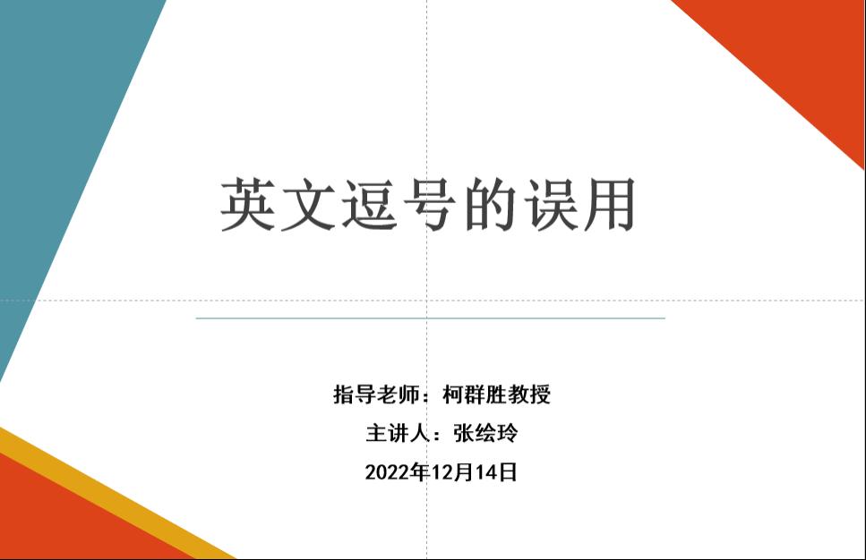 第二位汇报人张绘玲同学为我们讲述了标点符号的正确用法,侧重讲解在处理文本时英文逗号的误用以及正确的使用方法。张绘玲通过一个趣味互动引出她的主题。她首先提到9月24日是National Punctuation Day,这是提醒人们正确使用标点符号的特殊日子。然后张绘玲给出了标点符号汉字编码的国家标准,并认为字体不统一导致符号样式有差别。随后她总结了逗号的几种误用:反映主从关系的逗号的误用、固定词组后逗号的误用、部分副词后加逗号等。最后总结了逗号的正确用法,并提醒同学们在翻译文本的过程中,一定要注意标点符号的正确使用。