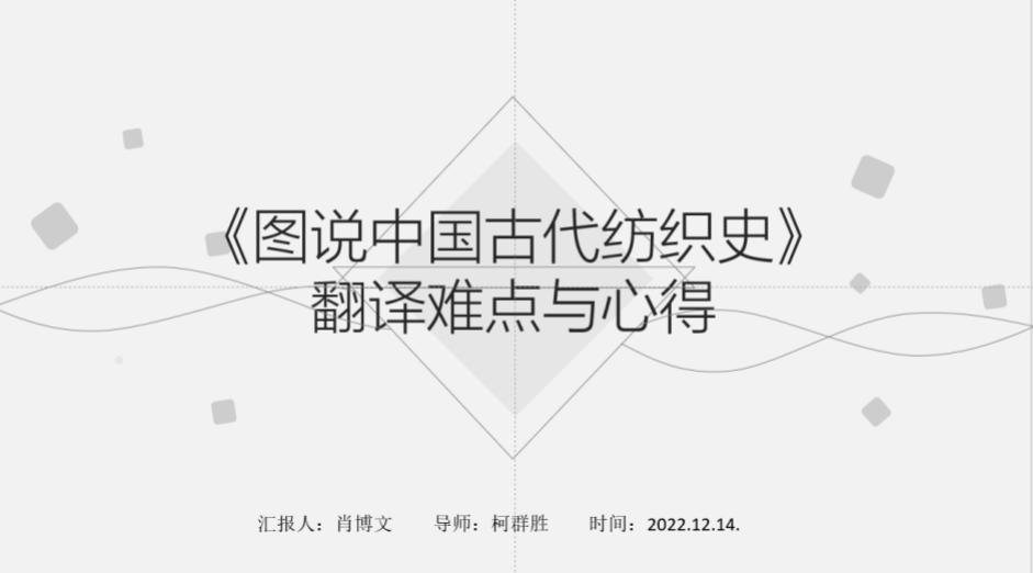 第一位汇报人肖博文同学分享的是《图说中国古代纺织史》的翻译难点与心得。肖博文同学首先对该书籍进行了详细介绍,其次提出了她所采取的翻译理论,她认为在翻译时,应根据文本特点选择合适的理论。据肖博文介绍,该书中有较多复杂汉字,如甗、籰、軠;词组多为术语,如并丝、整经、纺专;句子多为文言诗句、流水句和无主语句;篇章大多为隐形衔接。针对这些文本特点,她采用了艾克西拉的文化专有项翻译策略和奈达的功能对等理论,对所选章节内容中的字、词、句、篇进行翻译处理。此次翻译的难点主要分为四个方面:纺织类的专有词汇、文言古诗、文化词汇以及流水句和无主语句的翻译。肖博文认为,可以根据原文提供的配图以及官方给出的译文来辅助翻译专有词汇;对于文言诗句的处理,可舍弃韵律和意境,重点关注丝织相关表达。在翻译中,明确翻译目的,侧重翻译重点,合理增减。最后她总结了自身的翻译心得:深度理解原文,灵活运用不同的翻译理论,注重中英文化差异,保留源语文化异质性的同时尊重译入语表达习惯,争取将译文做到最佳。