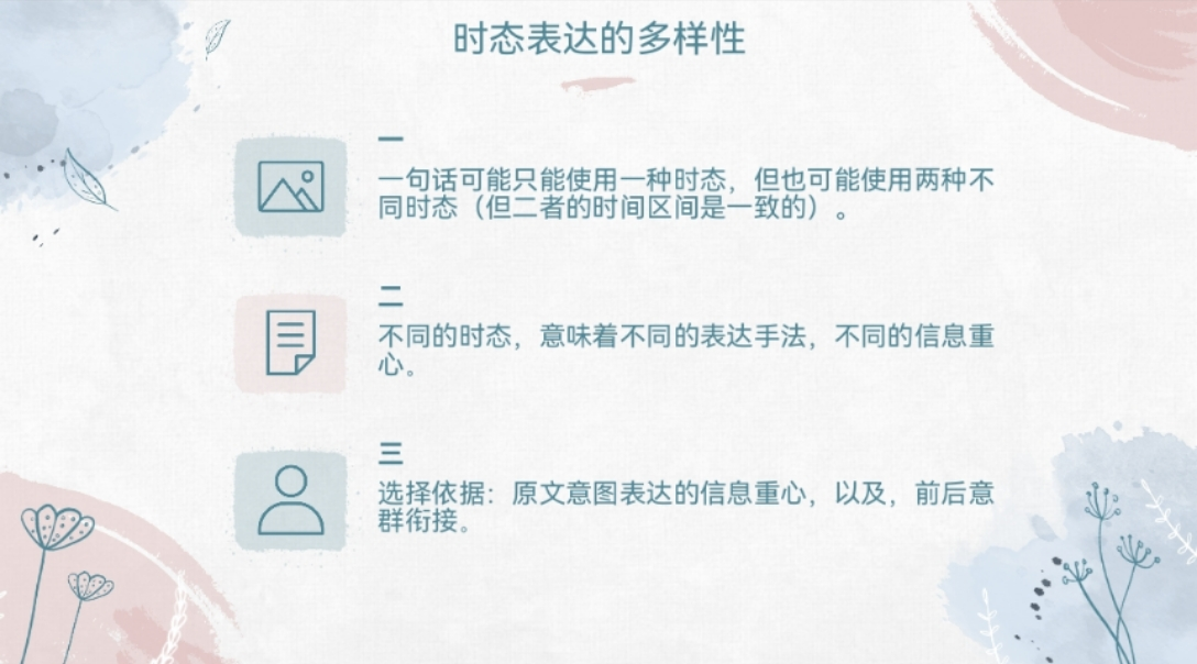 第三位汇报人22级MTI研究生贾斯淋同学分享的主题是汉英翻译的时态选择,分为时态概述、重点时态、时态选择的多样性、时态呼应四个部分。贾斯淋首先通过时态的定义介绍时态,分析了英汉语言的时态差异,总结了在汉英翻译时根据时间概念和原文语义选择时态的原则。随后,贾斯淋介绍了一般现在时、现在完成时、一般过去时、现在进行时、一般将来时五个重点时态的应用范围,最后分析了时态表达的多样性以及时态呼应现象。