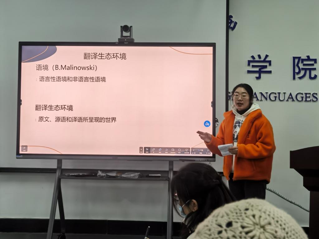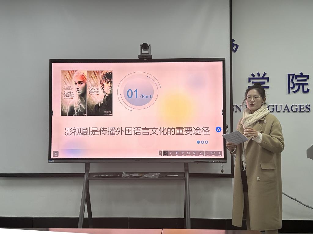 第二位汇报人彭怡然的主题是以《权利的游戏》为例,探讨目的论视角下影视台词翻译。她的分享分为四个部分:研究背景、字幕翻译特点、目的论概述,实例分析。首先她指出影视剧是传播外国文化的主要途径。她总结出字幕翻译有瞬时性、空间局限性、通俗性、综合性四大特点,并详细分析解释。接下来她给大家简单介绍了目的论的内容,指出影视作品正是以传递剧情信息为目的,要让目标语观众超越源语障碍,获得目标语的文化和信息。随后她以《权力的游戏》中的台词为例与大家进行分享讨论。最后,她总结出影视剧字幕翻译要注意以下三点:1.结合剧情背景,角色性格,专有名词典故;2.要以观众的理解和接受为目标;3.考虑目的语与源语中宗教、历史、社会、文化等因素的差异。
