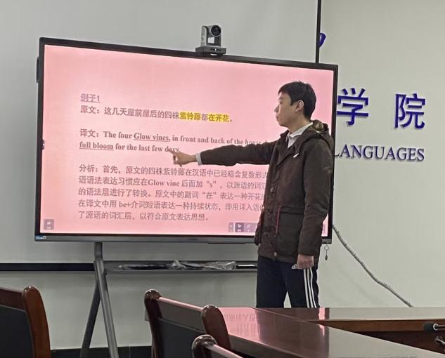 第一位汇报人余意同学以卡特福德的转换理论为理论指导,讨论了席慕蓉散文《写给楝楝》的翻译。他首先向大家介绍了卡特福德转换理论的背景及其研究现状,简单介绍了理论的框架,以图片的形式介绍层次转换和范畴转换的含义。随后从《写给楝楝》选取中文文本进行分析,对照英文翻译进行讲解。
