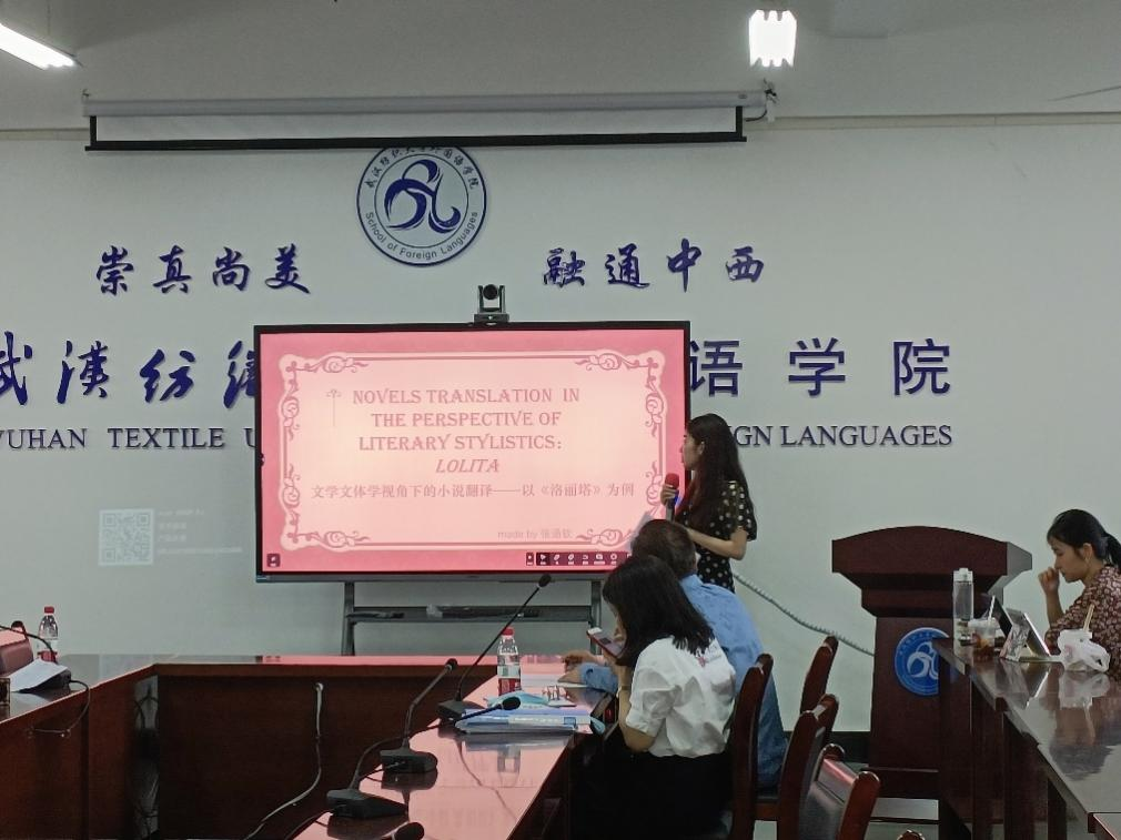 第三位汇报人张涵钦同学分享的主题是文学文体学视角下的小说翻译——以《洛丽塔》为例。她首先介绍了文学文体学和小说翻译,随后从文学文体学角度对小说《洛丽塔》译文展开分析,最后总结并反思。张涵钦同学认为文学文体学有利于学术界对小说译文质量进行更为科学、系统的评判,同时有利于增强译者的文体意识,从而更好地把握语言形式的美学效果和文体价值,做到译文与原文在内容与形式上的统一,避免“假象等值”。