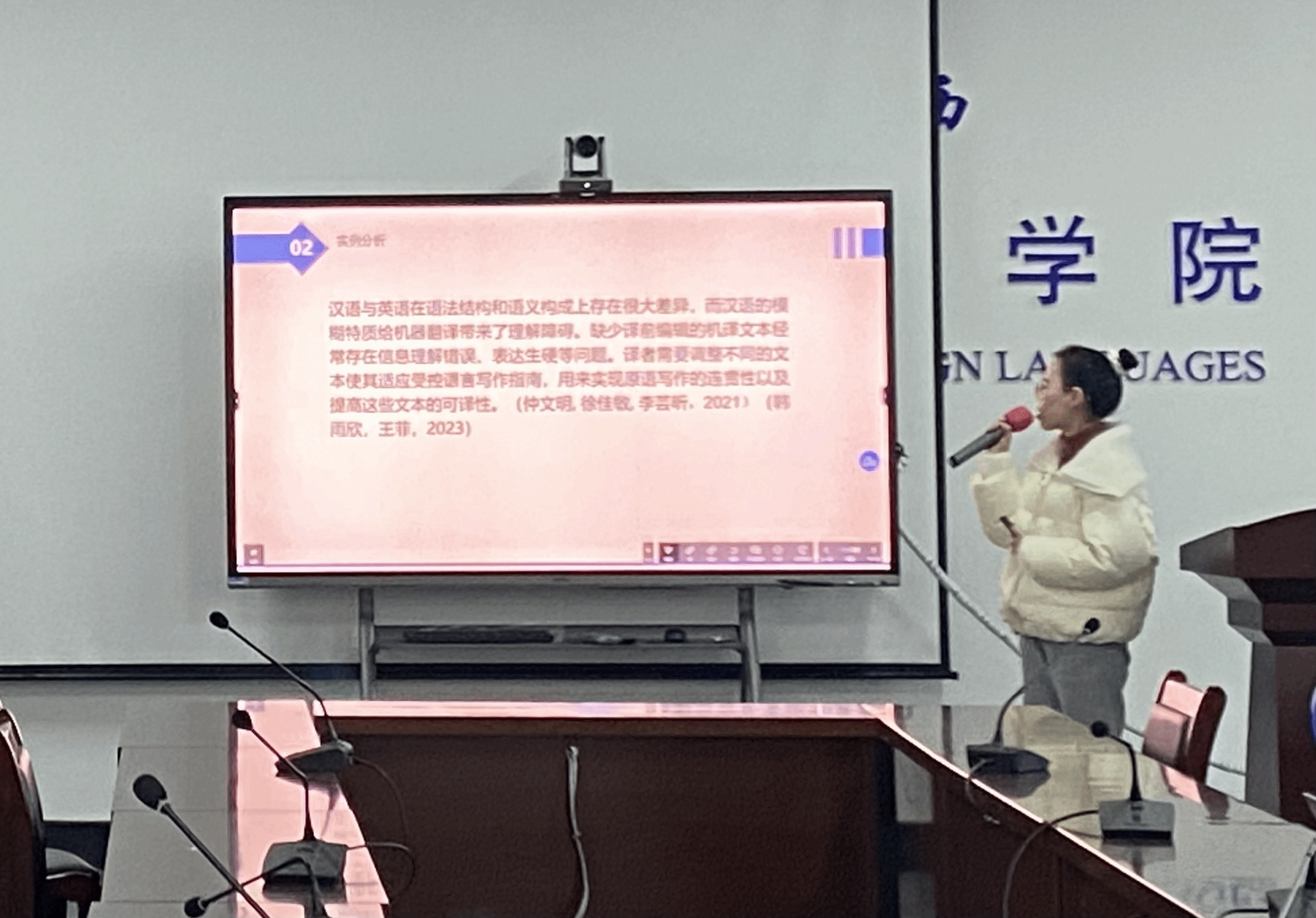 同学们汇报后,张守慧博士和陈芬博士对三位汇报人的演讲进行了精彩点评和深入讨论。她们从专业角度出发,对三位同学的演讲内容进行了梳理和提炼,为与会者带来了更多翻译实践中的思考和启示。张守慧博士认为翻译研究应该在某一个话题的某一点上进行专业性的研究,确定翻译文本的源文本作者的文化输出意愿是否强烈,没有文化输出意愿的文本研究是徒劳的。她建议MTI学生要在翻译前做好背景调查和资料收集,在此基础之上才能进行有效的翻译。陈芬博士则是对张守慧博士的点评做出了肯定,并且建议同学们之间要多交流经验,探讨方法,共克难点,在建议和批评中成长自己。