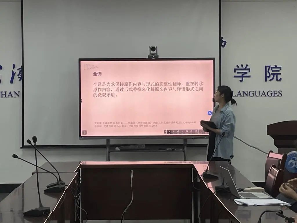 第一位汇报人何江坪同学从全译理论视角展开,探析纺织科技文本的英译。她首先简要分析了全译理论,然后将理论结合实践,与大家详细探讨了她在大创项目中翻译的纺织科技文本。最后,汇报人向我们分享了其此次翻译项目的心得,总结了运用全译理论指导实践的方法,希望此次分享对大家能有所启发。