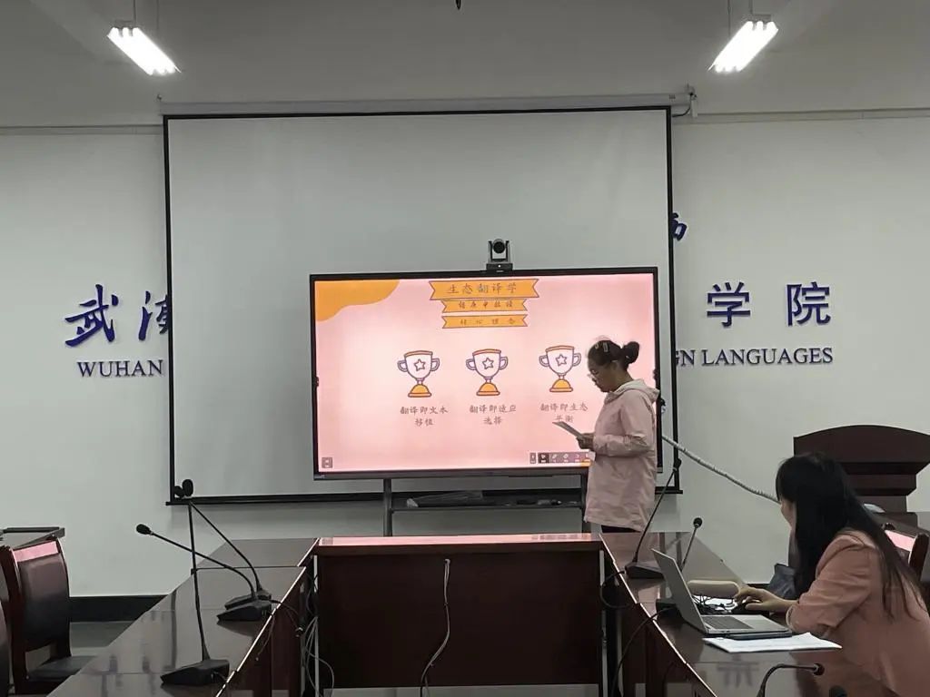 第二位汇报人黄培之同学的主题是生态翻译学视角下的哈利波特翻译研究。对生态翻译学理论进行简要介绍后,黄培之同学将翻译实例与生态翻译学理论下的三维转换方法紧密结合,从语言维的转换,交际维的转换以及文化维的转换三方面对翻译实例进行探析,并做出总结反思——即译者是整个翻译活动的中心。