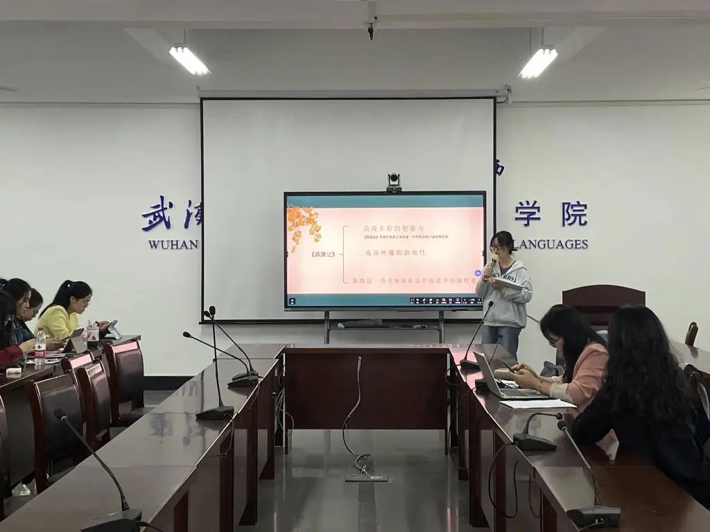 第三位汇报人彭怡然同学向大家分享了《西游记》中主要人物服饰的翻译方法,其分享分为研究意义,服饰英译分析以及总结反思三部分,彭怡然结合具体翻译实例,分析了《西游记》译文中常用的翻译手法,最后对其探析做出了总结反思。