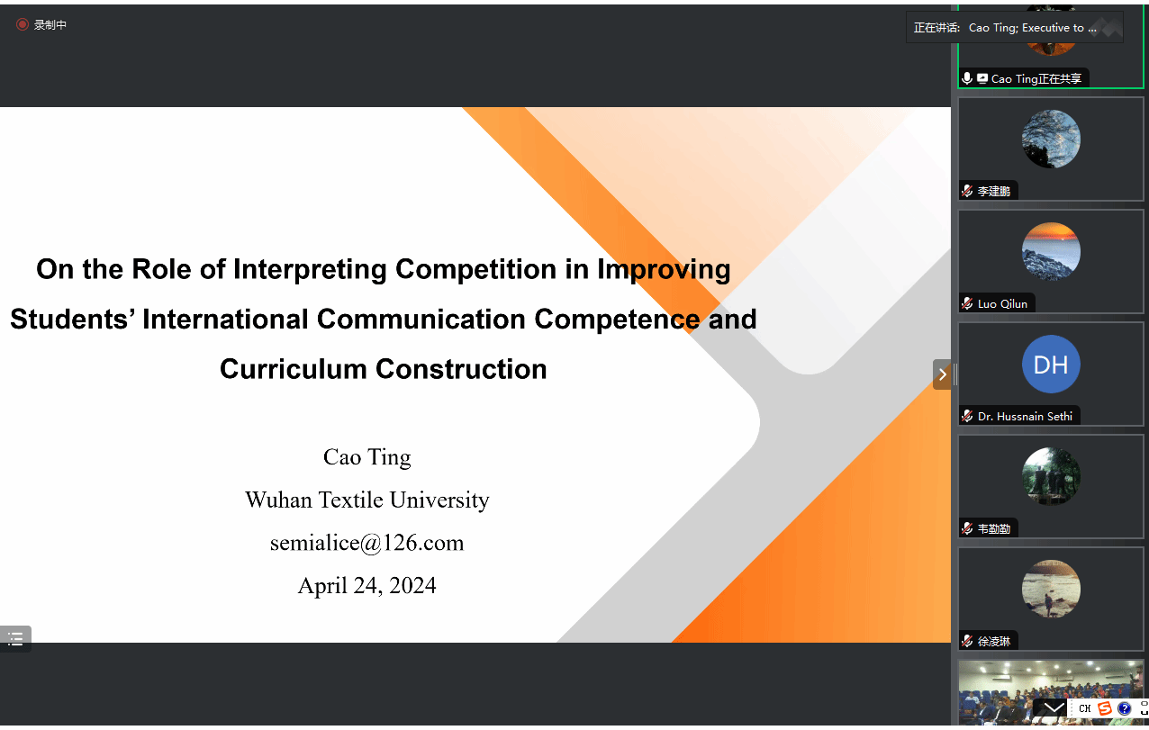 24日下午的会议由副院长罗绮伦和巴方教师共同主持。曹婷在会上做了“口译竞赛在提升学生国际交流能力和课程建设中的作用”的主旨报告。她指出在今天的国际交流中话语权是不平等的。英语是国际交流的主要语言。全世界应用最广的社交媒体多数主要来自美国,这就导致西方发达国家占有话语权优势。国际新闻主要关注发达国家,不发达国家很少被关注甚至被忽略。口译竞赛能提升老师的研究能力和学生的国际交流能力,口译大赛成了学术界和语言服务的桥梁。最后曹婷简要介绍了中国的各种口译竞赛。