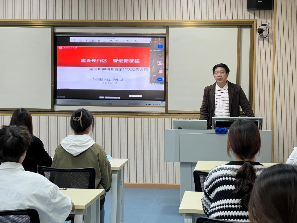 为进一步学习贯彻湖北省第十二次党代会精神,提高同学们的政治思想,10月13日下午2点在崇文楼206B开展湖北省第十二次党代会精神宣讲活动,本次活动由williamhill官网党委书记胡中原主讲,各班班长及团支书在线下参会,其他同学在线上参会。