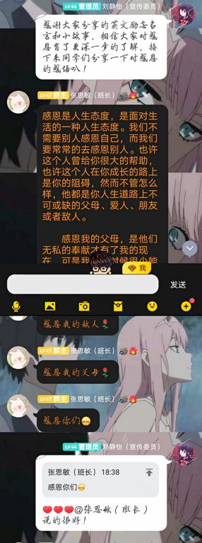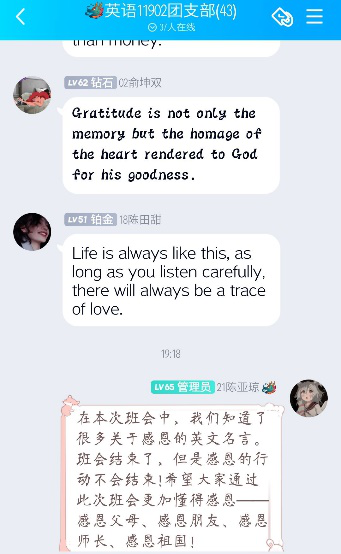 为了更好的把资助宣传、资助育人与思想品德教育有机结合起来,培养学生的感恩意识、诚信意识、励志精神和健康人格,11月27日-29日,williamhill官网各班在班级QQ群内开展以“心存感恩,与爱同行”为主题的系列诚信感恩教育活动。