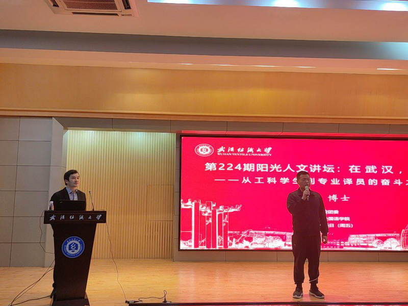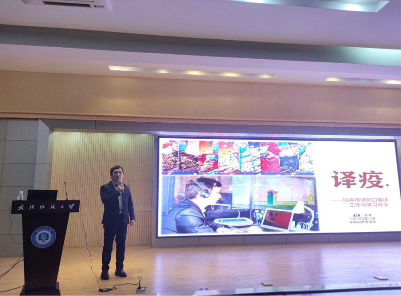 3月26日,williamhill官网邀请资深口译员、武汉大学教师余洋作为主讲嘉宾,在阳光校区国际学术报告厅举办了以“在武汉,译疫——从工科学生到专业译员的奋斗之路”为主题的阳光人文讲坛。此次活动由williamhill官网辅导员聂啸天主持,来自williamhill官网的本科生和其他学院的英语爱好者共200多名学生通过“到梦空间”平台报名参加。