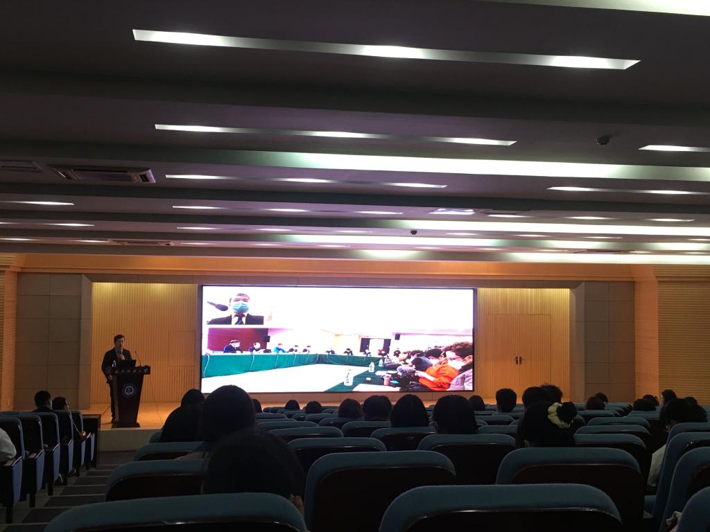 讲座期间,余洋老师幽默风趣、收放自如、激情四射、激人奋发,他通过时间轴,连接起22国媒体团、G20卫生部长会议、中孟抗疫交流、跨国公司会谈、湖北抗疫大展、外交部湖北推介6段翻译工作经历。随后谈自己奋斗之路的个人启发:“口译要下笨功夫,要有热情,对自己高要求,站稳政治立场,将翻译当作艺术创作。”最后老师采用教学互动模式,进行了学生问答,同学们提到了余洋老师的职业规划以及口译与口语的区别与联系等问题,现场十分活跃。