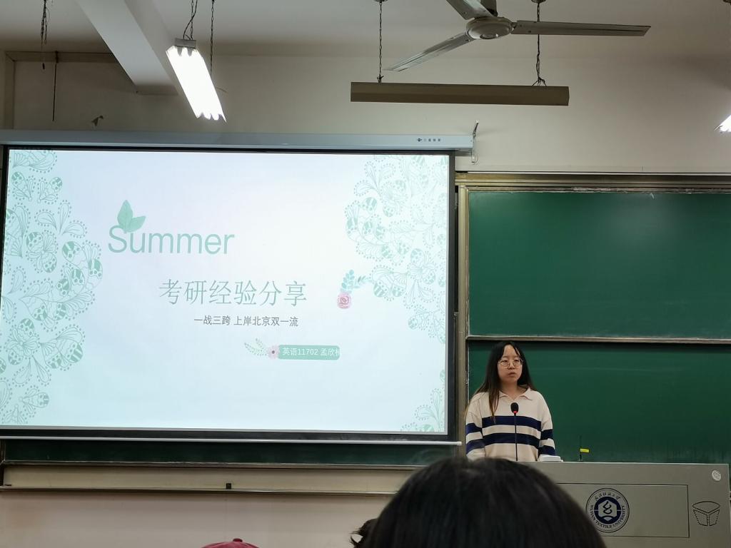 首先,以优异的成绩考入了北京师范大学、武汉理工大学、香港中文大学、西南政法大学等高校的10位学姐为同学们分享考研经验。交流会上,她们针对同学们关心的考研问题作了详细分析与指导。孟欣楠学姐强调了目标院校的选择,针对相应的院校制定学习计划;许彤学姐从思想政治理论、翻译硕士英语、英语翻译基础及汉语写作与百科四个方面介绍了英语笔译专业,让大家加深了对该专业学习方向的认知;张君怡学姐介绍了出国留学的注意事项;郑静怡学姐从准备、规划、建议、心态四个方面详细展开,并且强调了志同道合的研友的重要性;杜阳洋学姐让大家感受到了坚持的力量;郑震与凡浩铭学长表达了对英语专业的喜爱与付出,诠释了皇天不负有心人的道理。