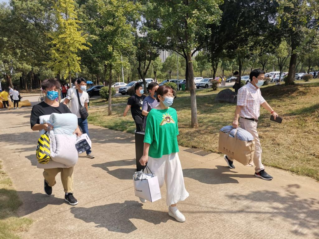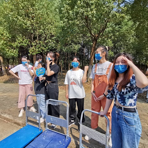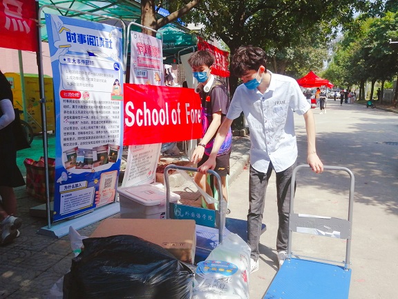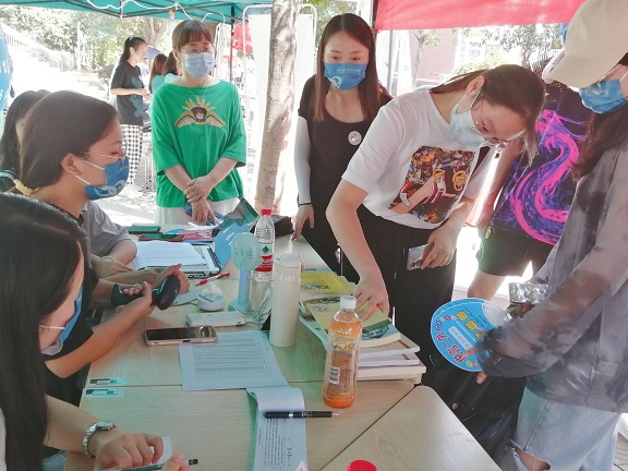高年级的在校生们不仅为学弟学妹们每人捐赠了一本自己读过的好书,还特地在上面贴上了印有学院标志的圆形书贴,饱含象征意义。为达到防疫要求、办好让学生和家长都满意的迎新活动,早在九月初,学院就开始在全院范围招募迎新志愿者,迎新队伍里不仅有学院领导班子成员,还有职能部门成员和专业教师,学院还安排了一对一迎新志愿者,确保每位新生都有志愿者全程协助入学。迎新工作开启第一天,学院的领导班子早早地就带领志愿者老师和学生们积极出动,蹲守在各个迎新点等候新生的到来。学院提前为志愿者们订制了一批具有学院特色的口罩,辅导员聂老师说:“戴上特制口罩后,新生就能更快地找到我们的志愿者了!”