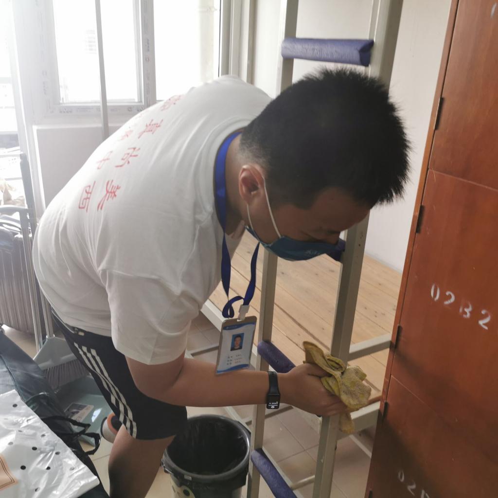 图为志愿者老师帮助重点学生整理宿舍、打扫卫生
