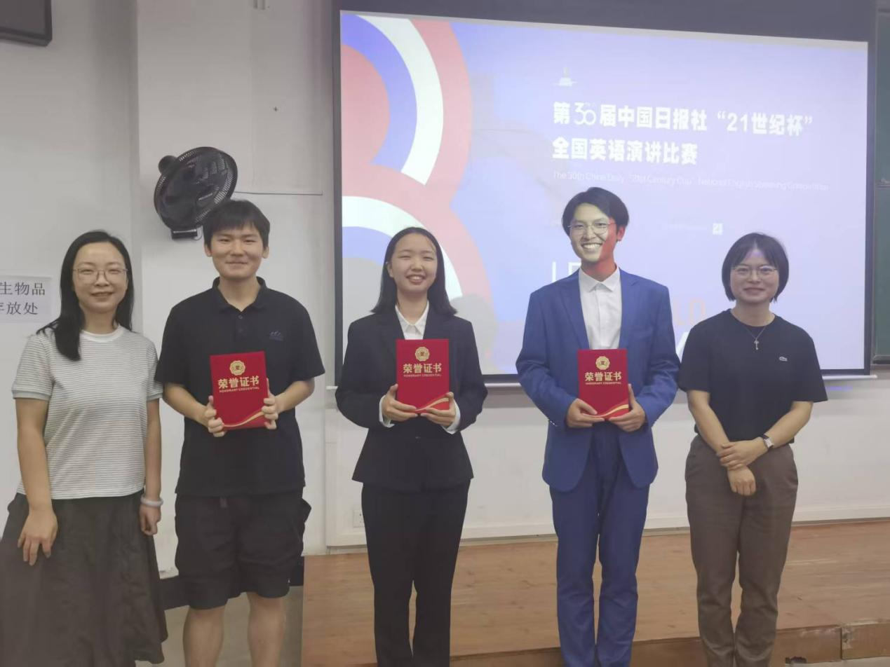 本次比赛主题为“Living Within and Beyond the 21st Century”。比赛流程由下面三部分构成:第一,已备演讲(限时4分钟);第二,即席演讲(限时2分钟);第三,现场问答(两个问题,合计2分钟),每位选手共计8分钟。选手们演讲内容丰富多彩,探讨了21世纪人工智能的发展带来的社会变革,以及当今大学生该如何运用和应对技术带来的机会和挑战,共同创造更加美好的明天。经过激烈的角逐,英语专业的程芷萱同学以其扎实的语言基本功、敏捷的思维和宽广的知识面斩获冠军。英语专业的谢陈晨同学及刘彤飞同学分别获得亚军和季军。