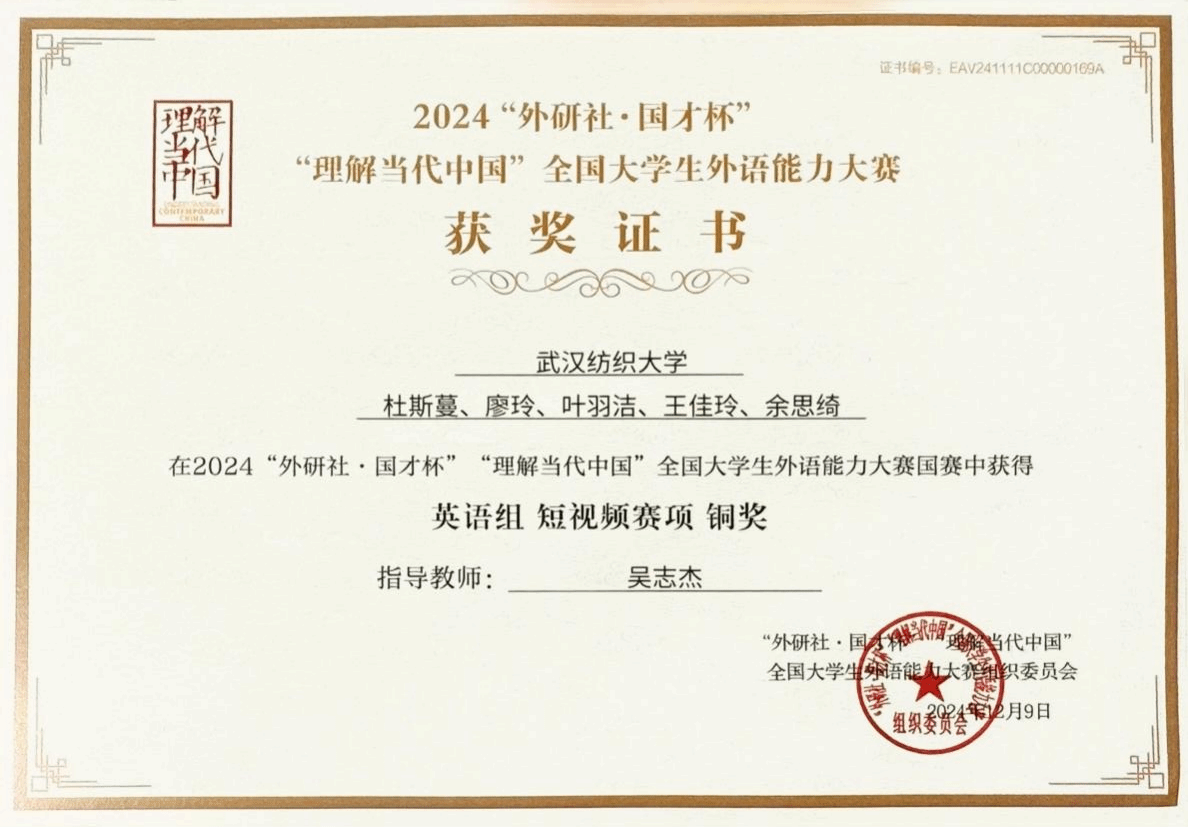 近日,在2024年度“外研社·国才杯”“理解当代中国”全国大学生外语能力大赛英语组短视频赛项中,williamhill官网williamhill官网“数韵乡音队”荣获全国铜奖。该团队由杜斯蔓、廖玲、叶羽洁、王佳玲、余思绮五位同学组成,指导教师为吴志杰老师。团队原创作品Digital Dance: Prosperity on “Cloud” Wings(乡村有“数”,“云”上奔富),以数字乡村建设为切入点,展现中国在数字化进程中农业发展与乡村振兴的实践成效。