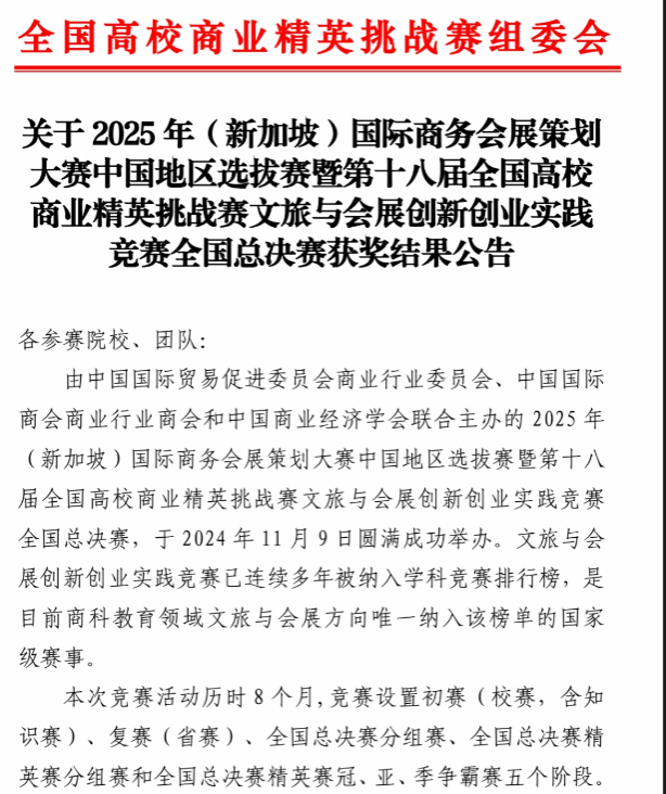 全国高校商业精英挑战赛由中国贸促会商业行业委员会、中国国际商会商业行业商会和中国商业经济学会联合主办,中国贸促会商业行业委员会教育培训部承办。文旅与会展创新创业实践竞赛已连续多年被纳入学科竞赛排行榜,是目前商科教育领域文旅与会展方向唯一纳入该榜单的国家级赛事。