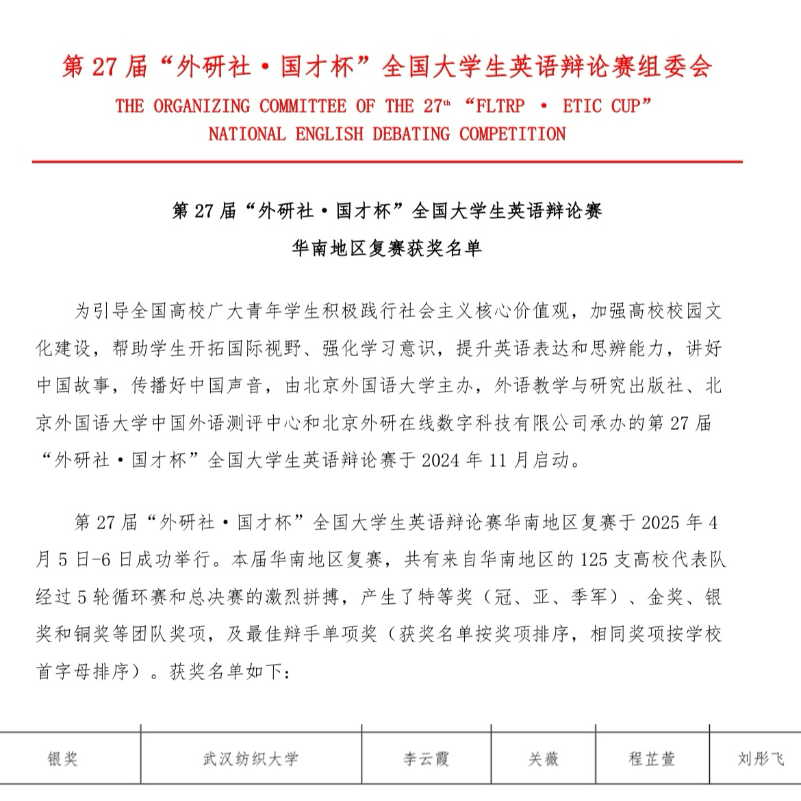 近日,williamhill官网 2024 级程芷萱、刘彤飞两位同学在第 27 届 “外研社・国才杯” 全国大学生英语辩论赛华南地区复赛中勇夺银奖!作为国内规格最高、影响力最广的英语思辨类赛事之一,本届华南地区复赛吸引了上百所高校的精英队伍同场竞技。在李云霞、关薇老师的全程指导下,两位同学经历了五轮循环赛的高强度比拼,他们以流畅的全英文表达、缜密的逻辑架构,对各辩题展开深刻洞察,从华南赛区近百支队伍中脱颖而出,最终斩获银奖。