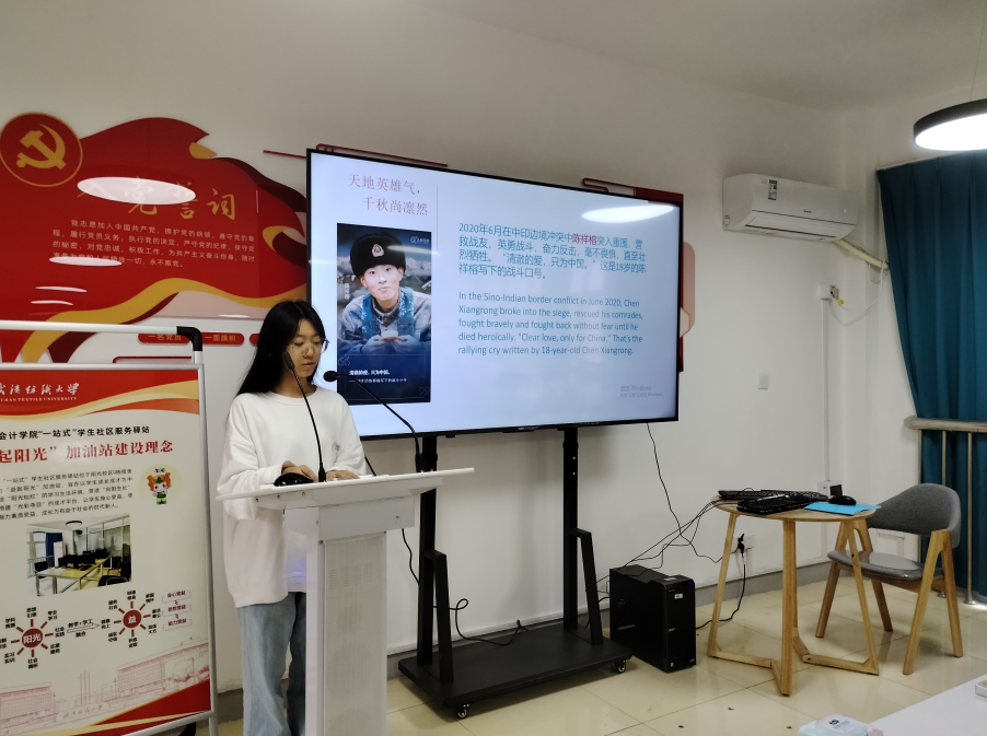 在会计学院“益起阳光”加油站、化工学院“一站式”学生成长服务站、计算机学院“1024学生成长服务站”,宣讲团成员邱福临和张思思围绕我国国防建设、国防教育、国际局势、青年斗志四个方面进行讲解。张思思用中英文向计算机学院的同学展示了我国近年来在军事方面取得的重大成就,并分析了俄乌战争、全球疫情、大国地缘竞争等国际局势问题,引导同学们正确认识国内国际形势,正确看待中国特色和国际比较。邱福临引用“海天卫士”王伟、戍边英雄陈祥榕的具体事例,号召青年学子要增强国防意识、民族责任感和使命感,积极参军入伍,报效祖国。