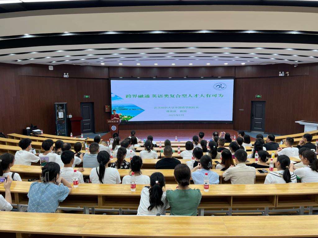 院长谭燕保教授对2023级新生加入外语学院大家庭表示欢迎,以“跨界融通,英语类复合型人才大有可为”为主题致辞。谭燕保从英语类专业是干什么的?williamhill官网外国语怎么样?我们如何一起成就孩子?三个方面对学科专业以及家校协同进行了具体说明。详细介绍了学院学科设置、师资队伍团队、第二课堂、英语类专业的培养目标以及教育教学软硬件资源,展示了学院历年取得的成就与荣誉,讲述了学院优秀学子典型案例,让新生同学和家长更加深入了解学院和英语类专业,并鼓励同学们信任自己的专业、持续努力,成为一个有颜、有才、有趣、有用的人。谭燕保鼓励家长们积极参与家校共育,接受同学们成长的节奏,向同学们传递责任,多关注同学们身心状态,做同学们的知心朋友。