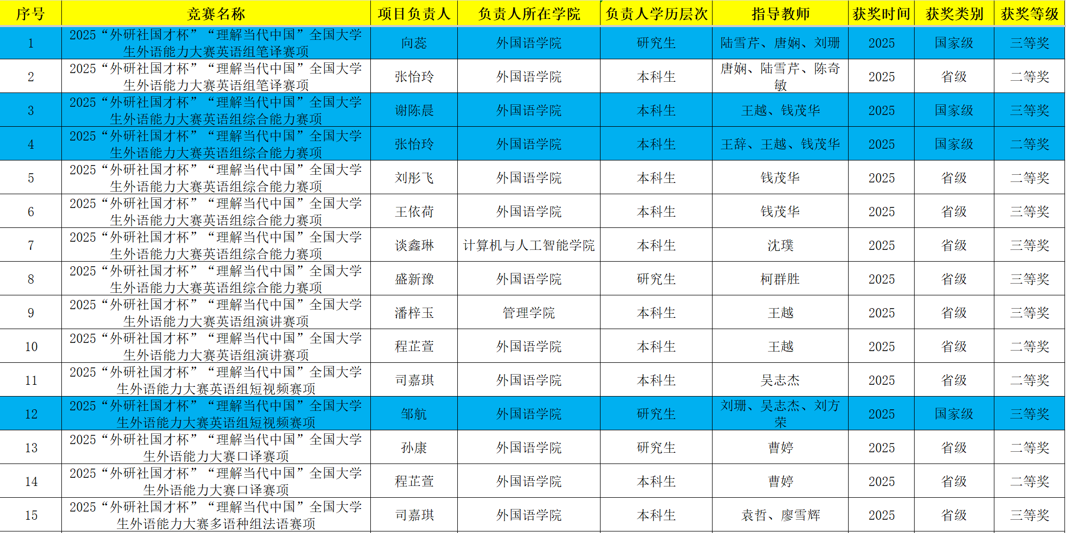 (一)国家级奖项实现新跨越:4 项国家级荣誉中,22级英语专业张怡玲同学获英语组综合能力赛国家级二等奖,25级MTI专业向蕊同学获英语组笔译赛国家级三等奖,24级英语专业谢陈晨同学获英语组综合能力赛国家级三等奖,24级MTI专业邹航同学及其团队获英语组短视频赛国家级三等奖。