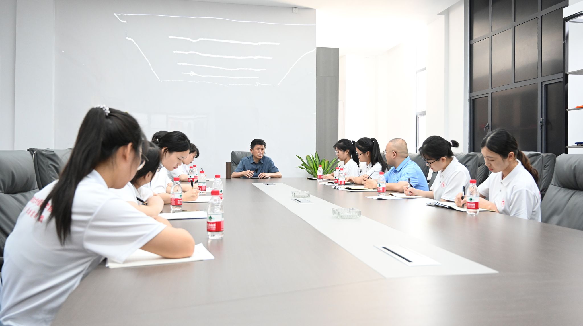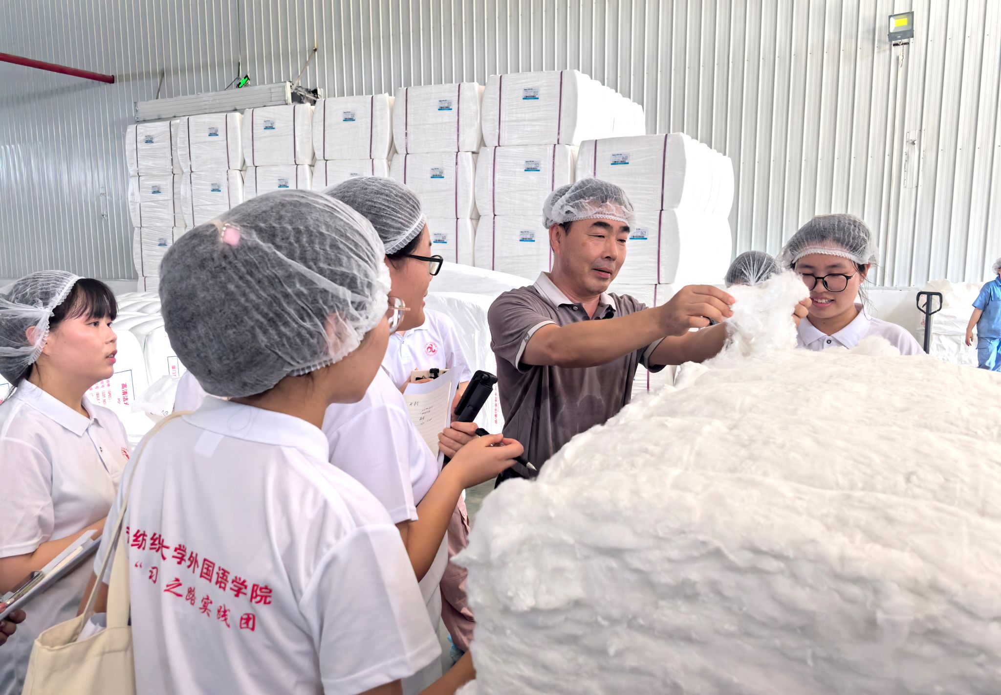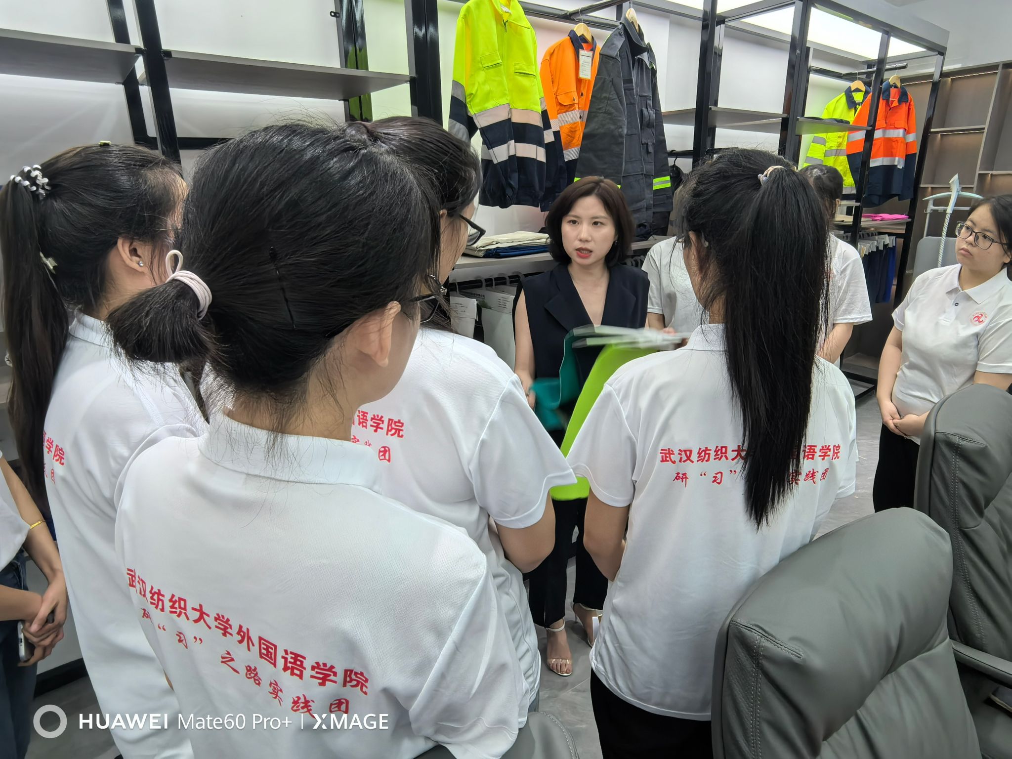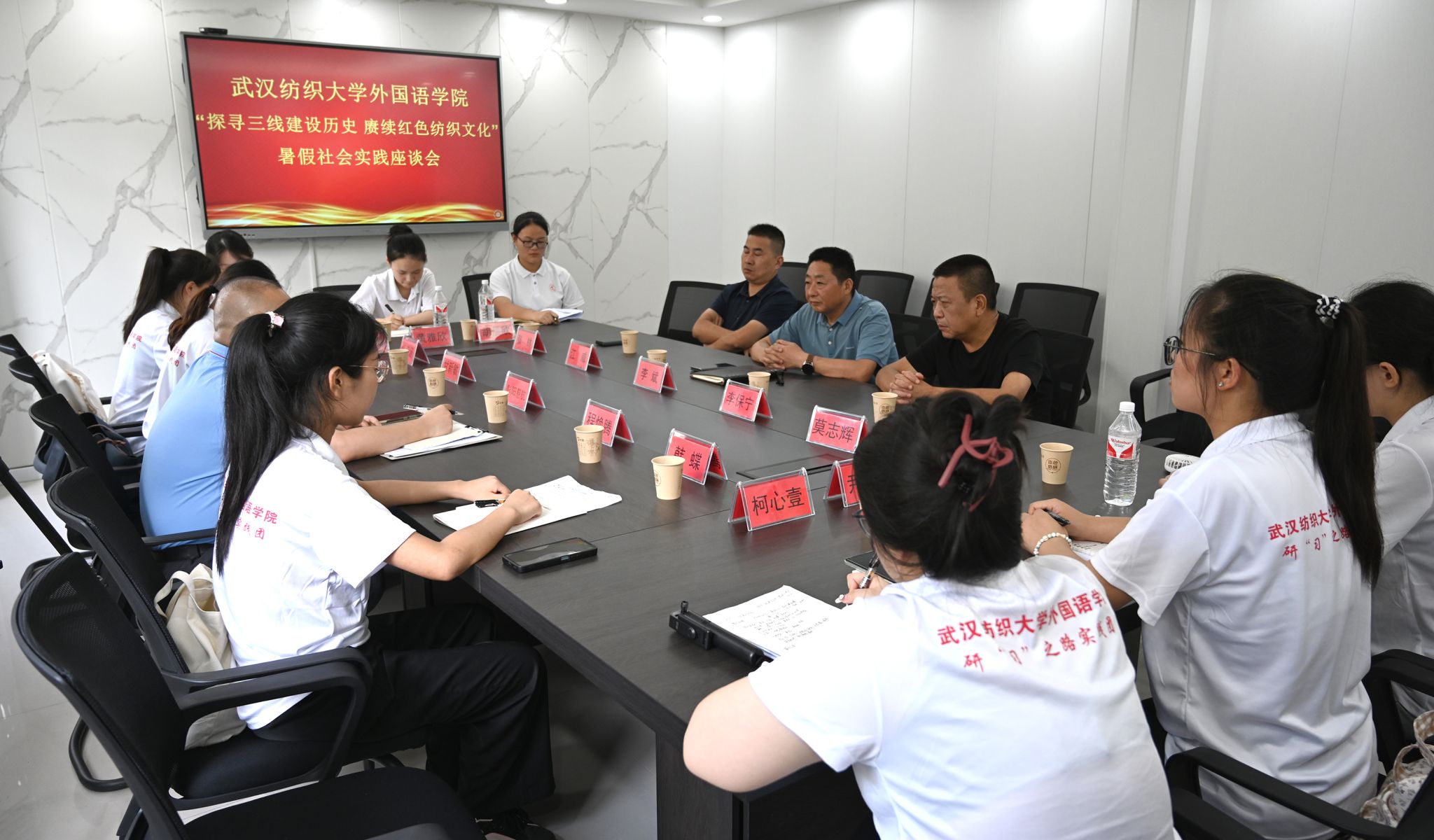 参观完车间后,团队成员对湖北祥源特种布有限公司董事长、赤壁市纺织服装产业协会会长余世贵。余世贵强调“三线精神”是一种对事业的执着坚守,对创新的不懈追求,以及对社会无私奉献的高尚情怀。他表示,祥源特种布在诞生发展在有三线建设历史的蒲纺片区,厂里不少工人和技术人员都是老蒲纺职工,正是有这股精气神的引领,企业从阻燃布的研发到冰感、抗震等新型面料的创新,三十余年始终专注于特种纺织品领域的研发生产。如今,企业每年参与国际展会二十余场,产品销路遍布全球。希望外语专业的同学们,在学好语言的同时,关注国际形势,了解国际贸易动向,未来在助力本土纺织服装企业在国际市场上的发展贡献力量。