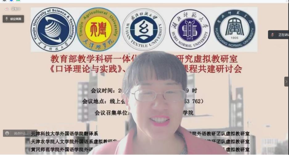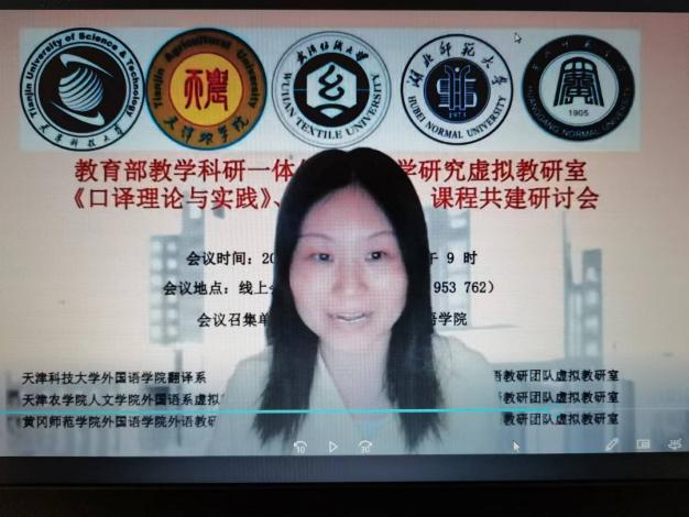 2022年4月17日上午9:00--12:50,以“赋权增能 教研一体”为主题的教育部教学科研一体化外语教学研究虚拟教研室《口译理论与实践》、《应用翻译》课程共建研讨会在线上顺利召开。此次会议由天津科技大学williamhill官网召集,williamhill官网williamhill官网和天津科技大学williamhill官网、天津农学院人文学院、湖北师范大学williamhill官网、黄冈师范学院williamhill官网联合主办。
