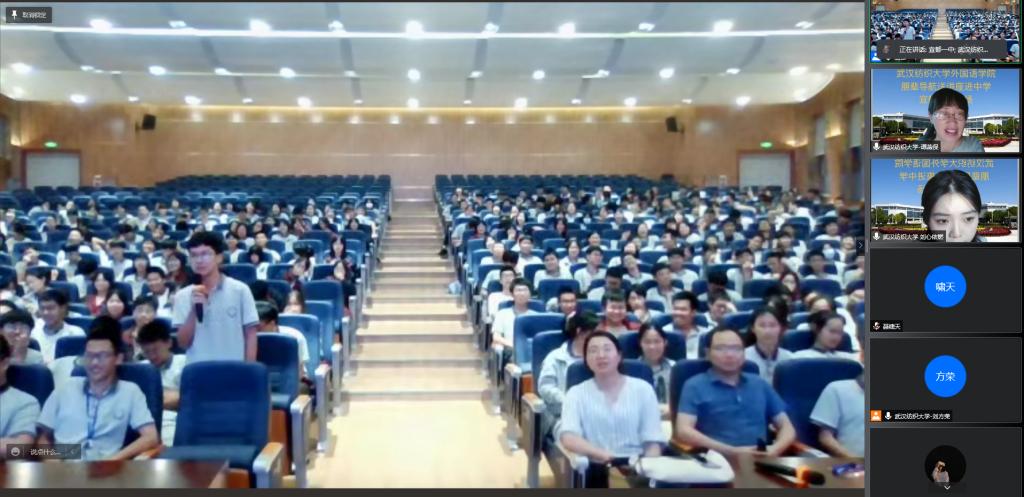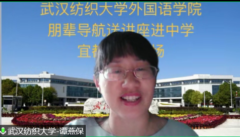 “听说月面国旗就是纺大制作的……”、“我前几天还在视频上看到纺大校长了……”宜都一中礼堂内氛围隆重且热烈。6月1日下午,williamhill官网联系生源地学校宜都一中,通过线上平台开展“朋辈导航——送讲座进中学”招生宣传活动,宜都市第一中学副校长邹庆禹、williamhill官网院长谭燕保、副院长刘方荣、副书记彭阳慈航、MTI中心主任刘珊、辅导员聂啸天参与宣传活动。2020级研究生顿新琪、2018级本科生刘心依燃作为主讲人,宜都一中300多名师生一同全程观看讲座。