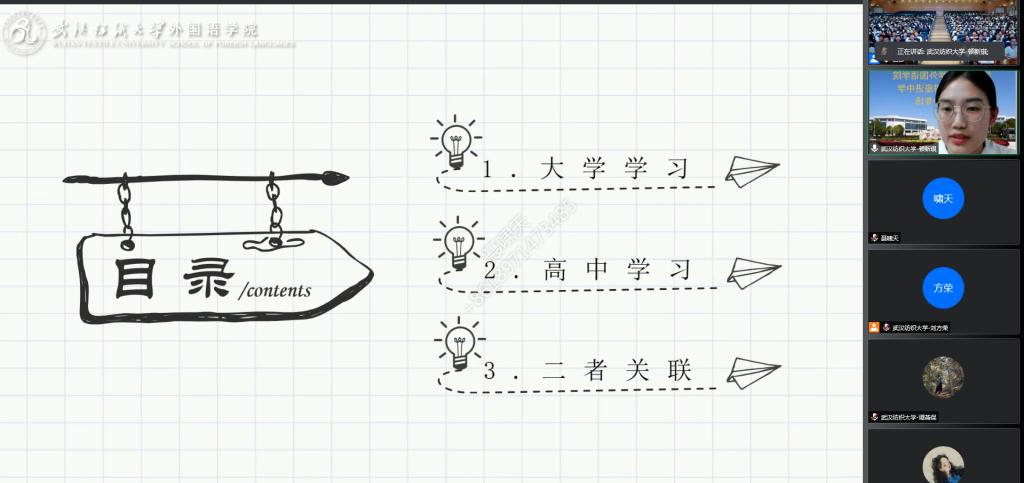 本科生代表刘心依燃以“学姐说外院”的方式,介绍了williamhill官网的办学条件、课程体系及特色、专业设置、录取情况等内容,重点以自己大学四年的丰富的学习、竞赛、实习实践经历,向宜都一中师生沉浸式展示了在纺大英语类学习生活是什么样的。