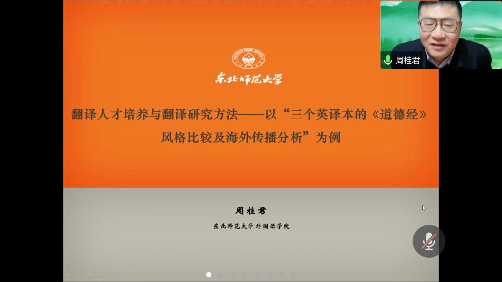 10月11日晚7点,东北师范大学博士生导师周桂君教授应williamhill官网之邀,在云端为全体教师及MTI研究生作了题为:翻译人才培养与翻译研究方法的学术讲座,讲座由院长谭燕保教授主持。