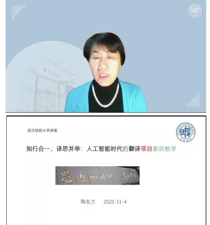 11月4日晚7:30,williamhill官网邀请复旦大学翻译系主任、MTI教育中心主任、博士生导师陶友兰教授在云端为全体教师做了一场精彩的学术讲座,题目为:知行合一,译思并举:人工智能时代的翻译项目案例教学。讲座由院长谭燕保教授主持。