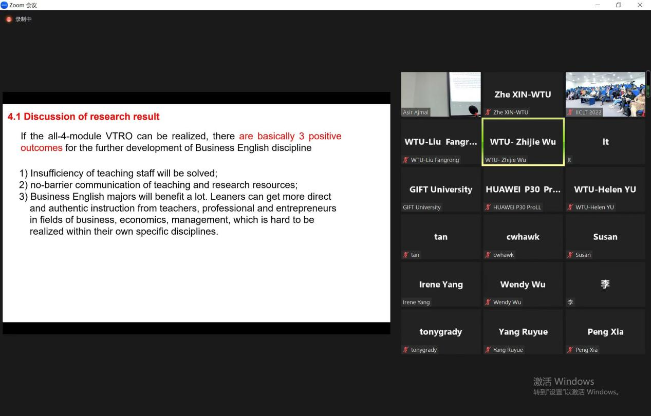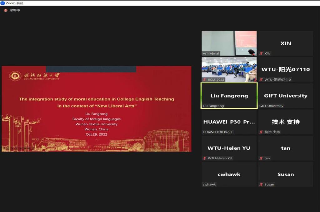 10月28日-29日,由巴基斯坦GIFT大学、williamhill官网主办,williamhill官网承办的2022国际语言教学跨学科会议(IICLT2022)在线召开。来自巴基斯坦GIFT大学、英国卡迪夫大学、考文垂大学和williamhill官网的专家学者相聚云端,围绕语言教学方法论、心理语言学与第二语言教学、语言教学与政治、在线学习与语言教学等议题展开研讨。williamhill官网副院长刘方荣和商务英语专业教研室主任吴志杰在International China Session部分宣读论文,williamhill官网教授、国际教育学院直属党支部书记林莉担任该分会场主持人。